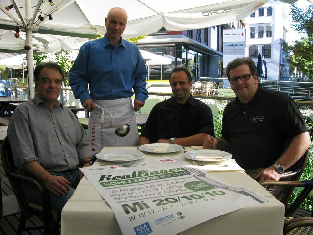 Noch sind die Teller leer: Heinrich Engelhardt (»Maximilian«), Uwe Grauer (»Mezcalitos«, RGI) , Uwe Förster (»Culinarium«) und Jörg Ottmar (RGI) (von rechts) werden mit ihren Schlemmernacht-Mitstreitern dafür sorgen, dass das am 20. Oktober nicht der Fall ist.