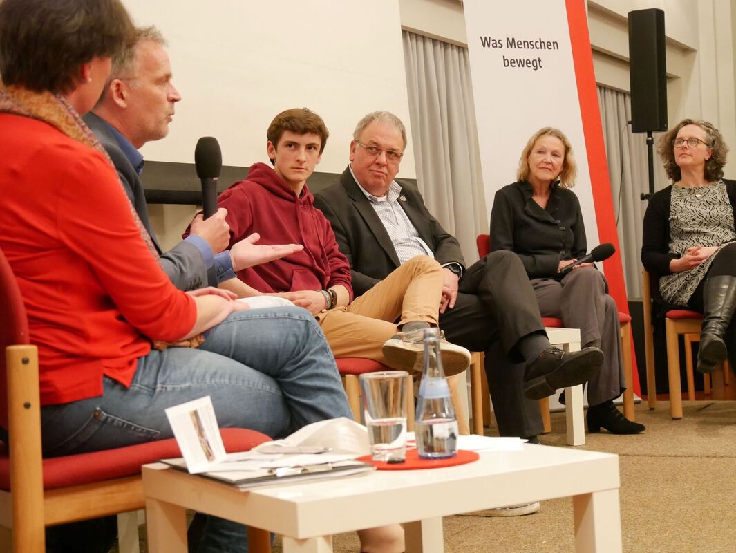 Gesprächsreihe zum Thema »Fair beim Klima« im Spitalhof (von links): Moderatorin Dr. Kathrin Messner, Wettermann Alexander Lehmann, Schüler Jaron Immer, OB Thomas Keck, Grünen-Politikerin Sylvia Kotting-Uhl und Moderatorin Dr. Claudia Guggemos.