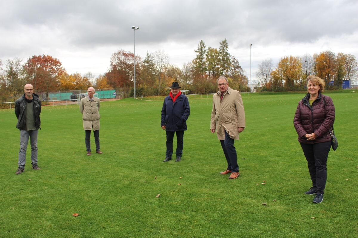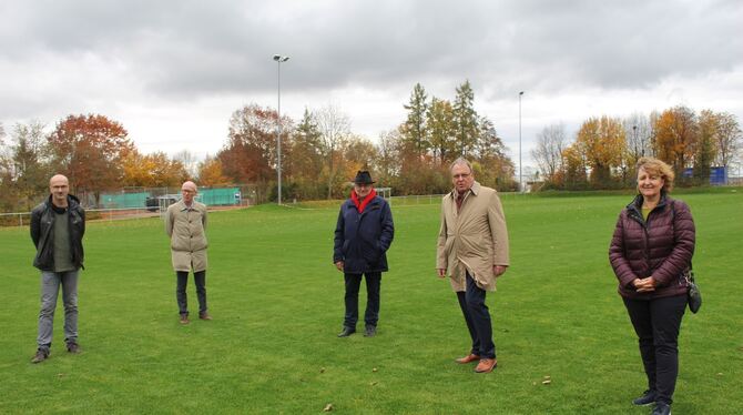 SV-Vorstand Udo Müller, Uwe Weber, Finanzvorstand Rolf Göbel, OB Thomas Keck freuen sich mit Bezirksbürgermeisterin Ute Dunkl (nicht im Bild) über den sanierten Sportplatz. FOTO: SPIESS