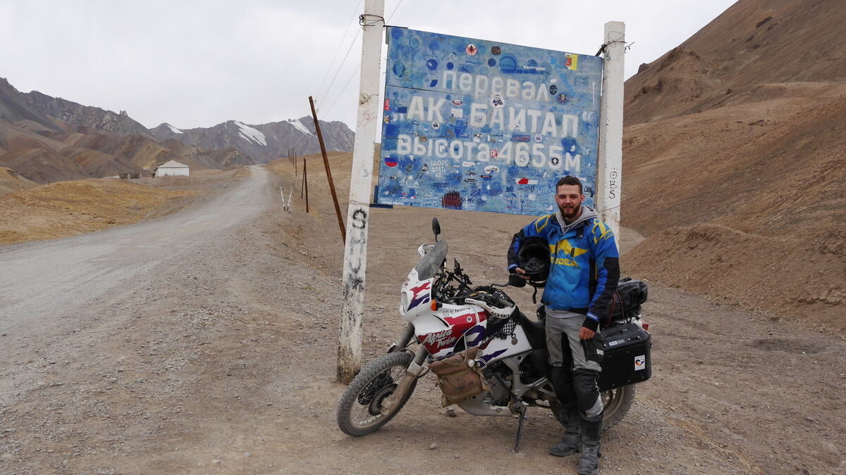 Felix Reisch auf dem Pamir-Highway in Tadschikistan. Der Ak-Baital-Pass führt auf 4 655 Meter, wo die Luft dünn wird. Höhenkrankheit war nur eine Gefahr von vielen.