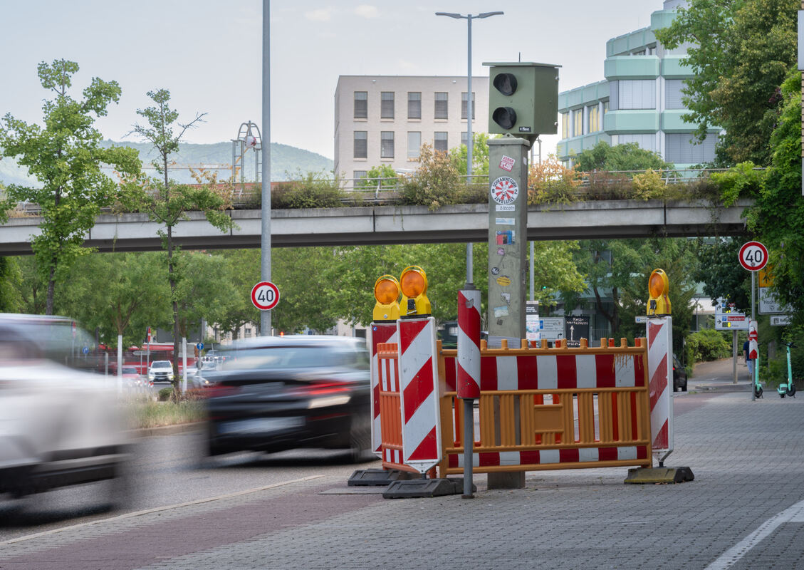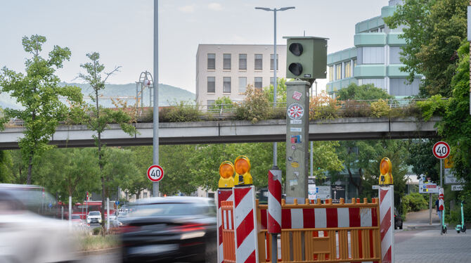 Monatelang war er (wenig) vermisst worden, jetzt ist er wieder da: der sogenannte »Rotlicht-Blitzer« gegenüber der Reutlinger Stadthalle. Wie schnell dort gefahren werden darf, zeigt das Tempo-Schild hinten rechts.