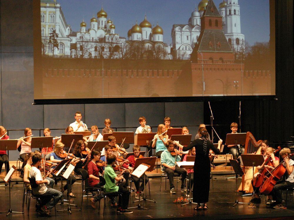 Das Nachwuchsorchester auf Russland-Streifzug mit passenden Bildern auf Großleinwand.