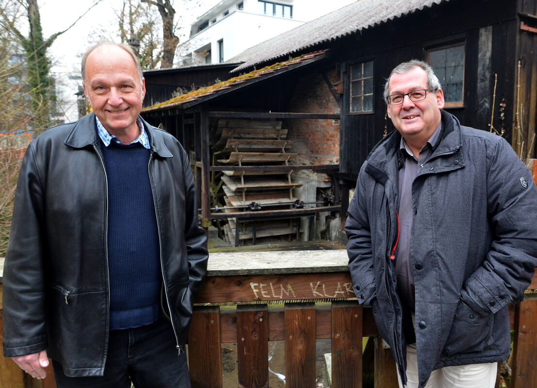 Wollen nicht verkaufen: die Eigentümer der Wegstschen Mühle: Heiko Sailer (links) und Joachim Stotz. Im Hintergrund das Wasserrad zum Antrieb der Säge. FOTO: NIETHAMMER