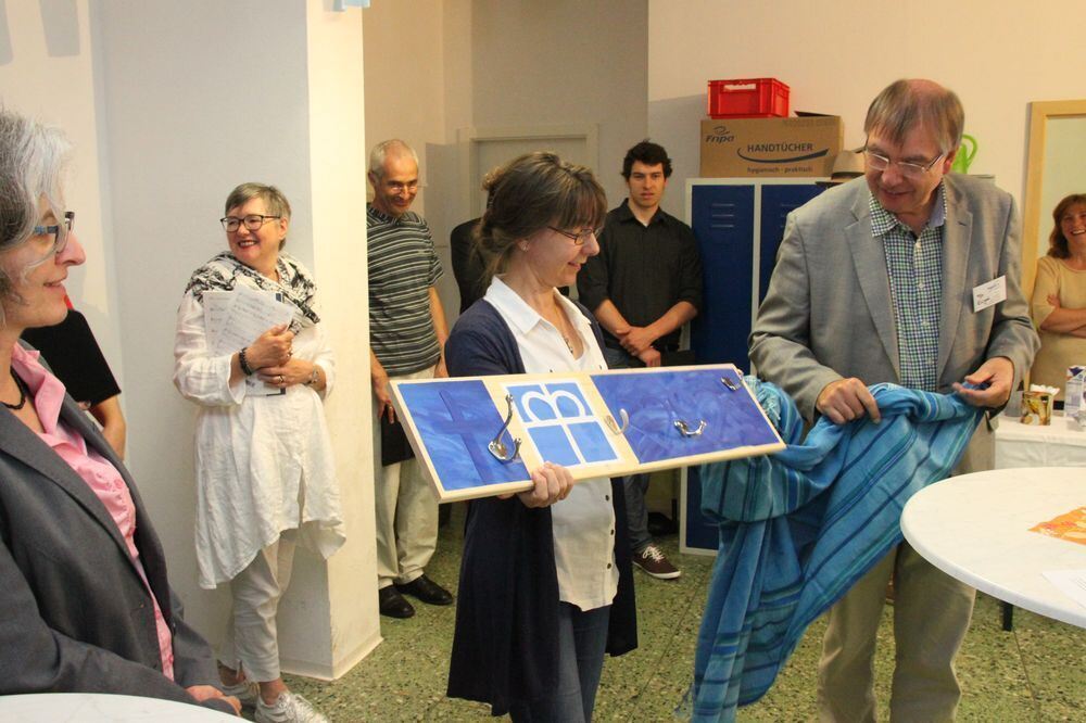 Antje Doms nahm als Teamleiterin in der neu eröffneten Zweigstelle der Diakoniestation Reutlingen am Samstag in Rommelsbach ein Geschenk von Pfarrer Christoph Zügel und Pfarrerin Beate Ellenberger entgegen. FOTO: LEISTER