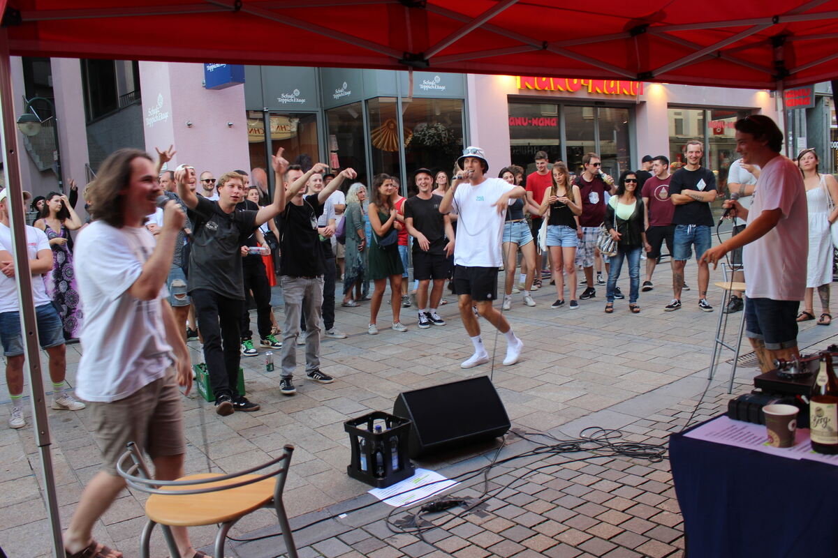 Auftritt beim ersten Späts(c)hoppen im Sommer: Viel Zustimmung für »Schwäbische Gässleraps« mit drei coolen Rappern vor der Buchhandlung Osiander.