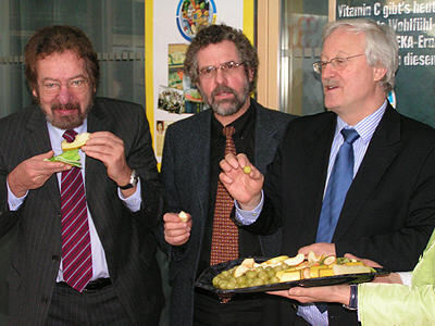 Gesund gegessen (von links): Ernährungsexperte Volker Pudel, Sportwissenschaftler Wolfgang Schlicht und Rolf Hoberg, Vorstandsvorsitzender der AOK im Land empfehlen unter anderem Müsli-Käse-Bällchen statt fetter Fritten.