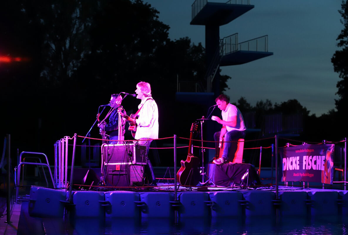 Auf einer schwimmenden Pontonbühne: Dicke Fische im Freibad Markwasen.