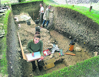 Ausgrabungen mit Fingerspitzengefühl und Zeichenblock: Anja Hornung (vorn), Gisela Dehlinger und Andreas Willmy im neuesten »Profil« am Rappenplatz, wo vor 3 000 Jahren die ersten Kelten siedelten. Sie hinterließen zum Beispiel getöpferte Feuerböcke (rechts), spätere Achalm-Bewohner die herrliche Fibel (Gewandnadel) aus Bronze.