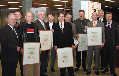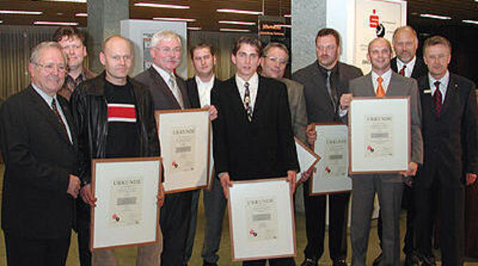 Die Prämierten des Innovationspreises 2003 mit KSK-Chef Eugen Schäufele (rechts) und Günther Hecht (links).