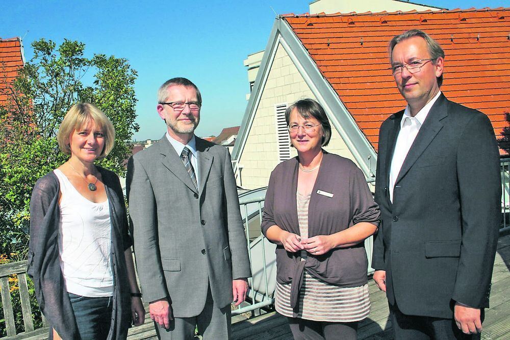 Treffen auf der Dachterrasse (von links): Marion Mattekat, Dr. Alwin Müller-Jerina, die Reutlinger Bibliotheksleiterin Christa Gmelch und Thomas Stierle . FOTO: OG