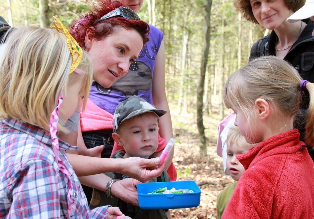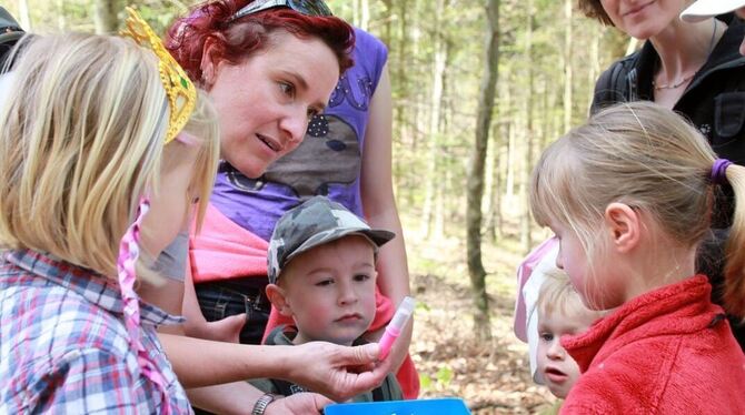 Geocaching mit dem Albverein Betzingen: Judith Koch mit kleinen Schatzjägern.