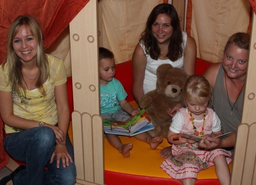 Freuen sich auf den Start des »Kidshouse Reutlingen« (von links): Die Erzieherinnen Marie Lamparter, Marit König und Bianca Schmidt. Im Bild mit Kindern in der Kuschelecke der neu gebauten Kindertagesstätte, die zehn Kindern Platz bietet. FOTO: SEITZ