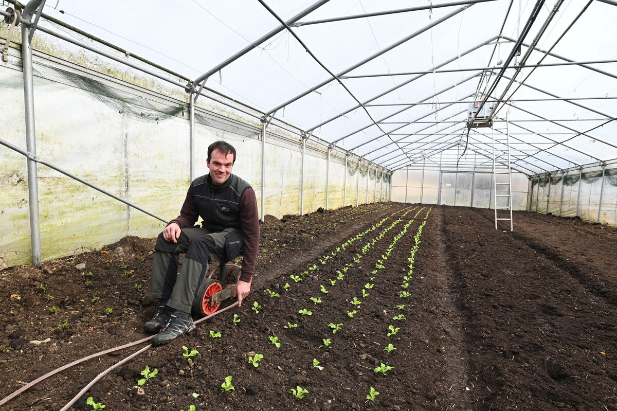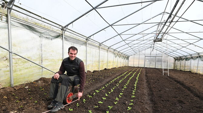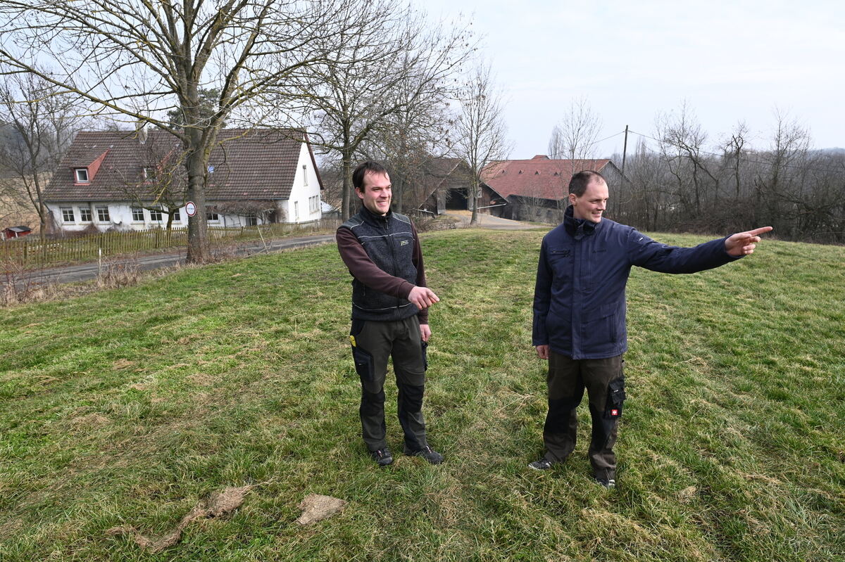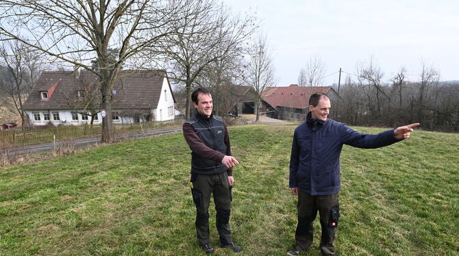 Da soll einmal der neue Milchviehstall stehen, zeigen die neuen Pächter der Alteburg, Martin Kuttler (links) und Johannes Braun.