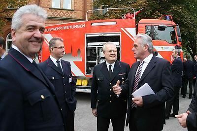 Rot sieht der Landesfeuerwehrverband nur bei manchen Bundesentscheidungen. Im Landes-Innenminster Heribert Rech (von rechts) sehen Landesfeuerwehr-Präsident Frank Knödler, Reutlingens Feuerwehrchef Harald Herrmann und Landesbranddirektor Hermann Schröder einen Mitstreiter.