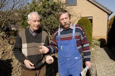 Eine Handvoll Grus aus einem der Bohrlöcher teilen sich Paul Müller und Wolfgang Waskow (links), der sein Eigenheim auf Erdwärme umstellt.
