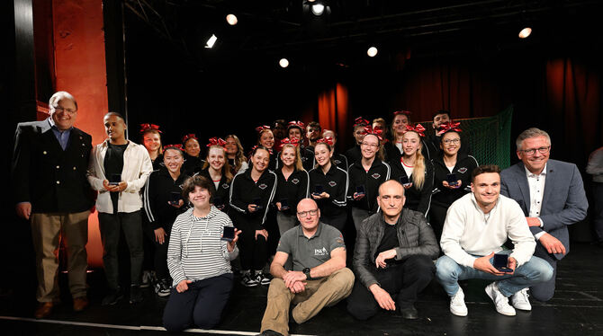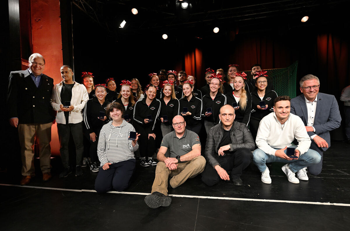 Einige der geehrten Sportler mit OB Thomas Keck (links) und Finanzbürgermeister Roland Wintzen (rechts).
