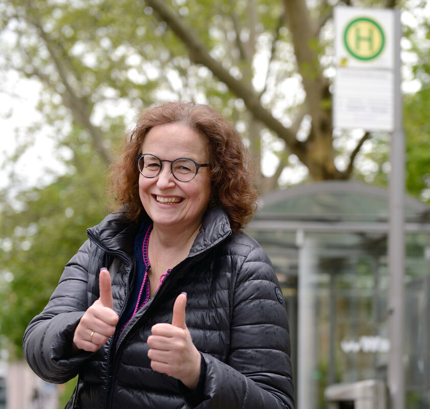 Daumen hoch für Bus und Bahn: Christina Schneider-Siemon nutzt den ÖPNV der Umwelt zuliebe. FOTO: PIETH