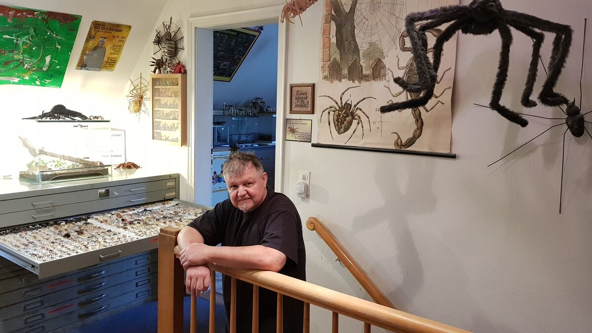 Thomas Floten ist Spinnenexperte. Er sammelt alles, was mit Spinnen zu tun hat. Sein Traum: ein eigenes Spinnenmuseum. FOTO: KÜSTER