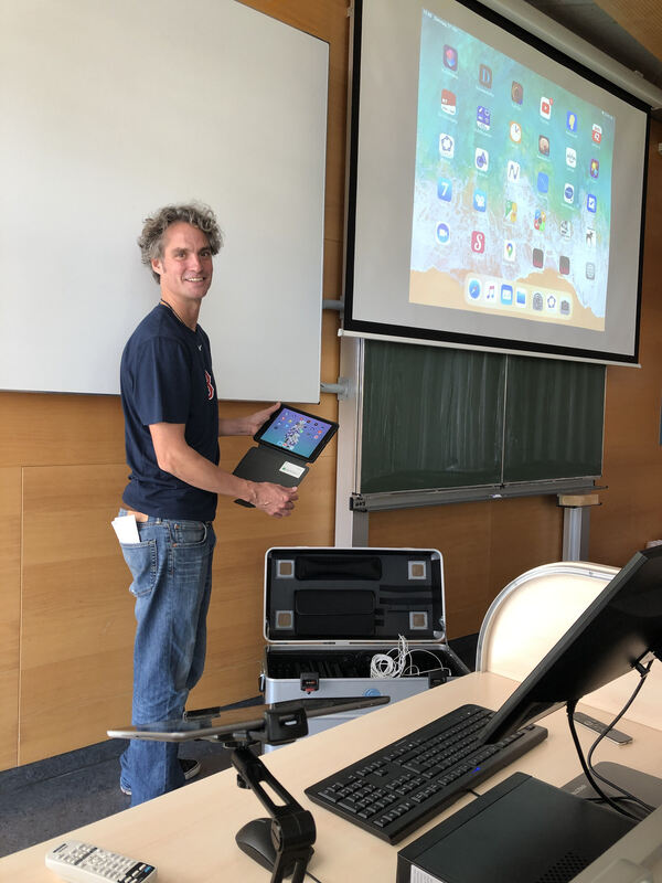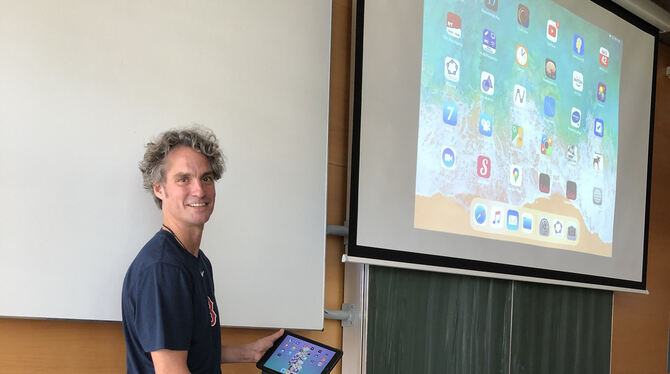 Marcus Fuhrich, stellvertretender Leiter des HAP-Grieshaber-Gymnasiums in Reutlingen-Rommelsbach, ist überzeugt von der digitalen Technik. Aus dem Rollkoffer hat er eines der zahlreichen Schülertablets hervorgeholt. Im Vordergrund ist der digitale Lehrerarbeitsplatz zu sehen und die digitale Leinwand überdeckt die alte analoge Tafel. FOTO: RITTGEROTH