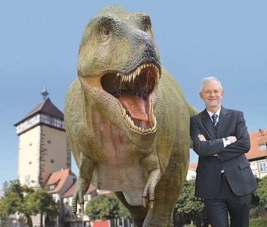 Zur Freiluft-Ausstellung »Giganten vor unserer Zeit« holt Klaus Otto, der »Vater der Reutlinger Dinos«, erstmals auch ein T-Rex-Modell nach Reutlingen. Fast müßig zu erwähnen, dass Otto für die GEA-Montage über sich hinausgewachsen ist. FOTOS/MONTAGE: PR/TRINKHAUS
