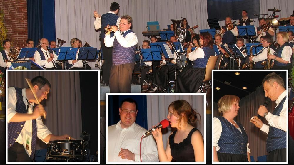 Marion Krohmer (unten rechts) erhält zur Verbandsnadel noch ein Präsent von Abteilungsleiter Thomas Thümmel. Juliane Lenhart und Stefan Mollenkopf (Mitte) sind gesanglich in New York unterwegs. Timo Glock (links) verblüfft mit Trommelartistik, und Dirigent Helmut Kassner (oben) spielt Solotrompete, während Schlagzeuger Julian Hölz dirigiert. FOTO-MONTAGE: SCHÄLE-SCHMITT