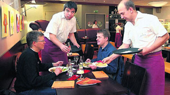 Markus Serif (Zweiter von links) und Heiko Isler (rechts) arbeiten im Service des Café Nikolai. Je nach Schicht beginnt ihr Arbeitstag um 8 Uhr oder um 11.30 Uhr.