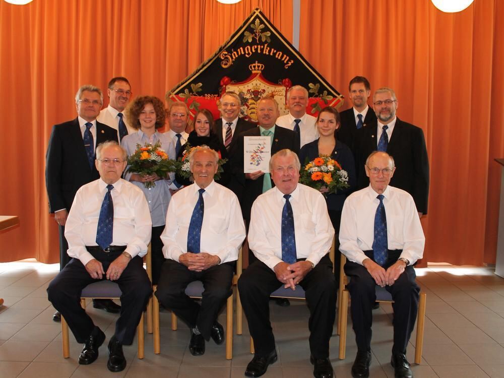 Bei der Matinee des Rommelsbacher Sängerkranz ehrte Bürgermeister Robert Hahn (hinten, Sechster von links) verdiente Mitglieder.