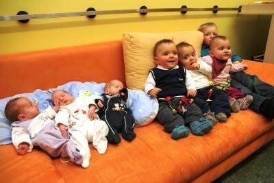 Zwei Mal drei macht sechs plus eins: Das Trio Anna, Hannes und Lorenz (von links) und ihre neun Monate älteren »Kollegen« Vincent, Constantin und Olivia mit dem großen Bruder Frederik.