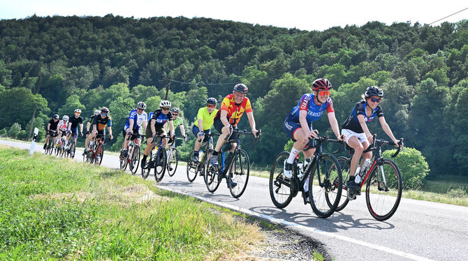 Extrem. Am Treffpunkt vier GEA-Leser in Alb-Extrem-Trikots. Ein Statement für Ausdauer und Biss. Den Rad-Marathon gibt’s seit 1984 in Ottenbach im Kreis Göppingen. Angehende »Kletterer«, wie Bergziegen in der Rad-Szene genannt werden, versuchen sich erst mal an der »Alb-e@asy« mit 90 Kilometern und 1.400 Höhenmetern, anspruchsvoll wird’s ab 160 Kilometern und 2.700 Höhenmetern. »Etwas für die wahren Extremisten«, so die Veranstalter, ist der »Traufkönig-Ultramarathon« mit 300 Kilometern und 6.000 Höhenmetern.