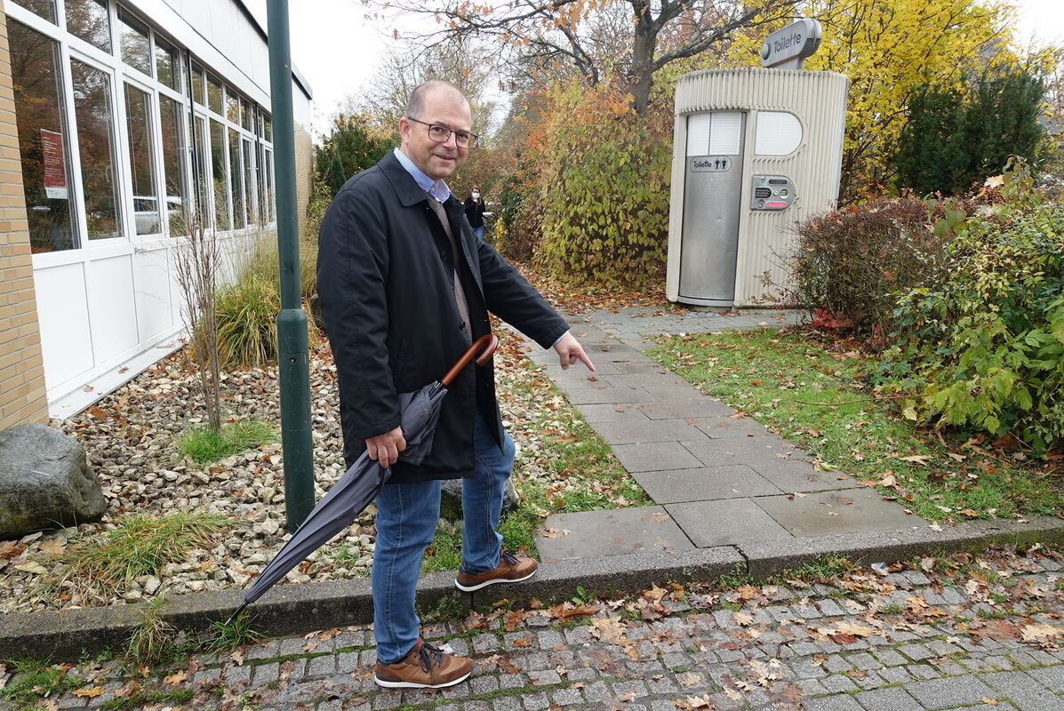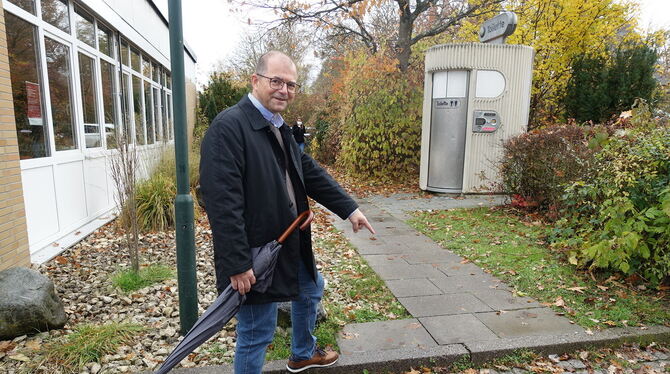 Igeloh-Sprecher Hannes Höltzel zeigt auf den Bordstein, der vor allem für Rollstuhlfahrer ein Hindernis sein kann. FOTO: DÖRR