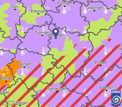 REUTLINGEN. Der Deutsche Wetterdienst (DWD) in Stuttgart hat eine amtliche Unwetterwarnung vor schweren Gewittern herausgegeben. Laut einer Karte auf der DWD-Webseite betrifft die Warnung, die bis Mitternacht gilt, auch Teile des Landkreis Reutlingen. Für den Südwesten des Kreises (Trochtelfingen), den Süden (Zwiefalten) und den Osten (Münsingen) zeigt die Karte auf der DWD-Webseite ab den Nachmittagsstunden bis in die Nacht zum Samstag schwere Sturmböen bis 100 Stundenkilometern, heftigen Starkregen bis 40 Liter pro Quadratmeter innerhalb einer Stunde und Hagelkörner mit einer Größe um zwei Zentimeter voraus. In der zweiten Nachthälfte soll die Gewitteraktivität nachlassen.