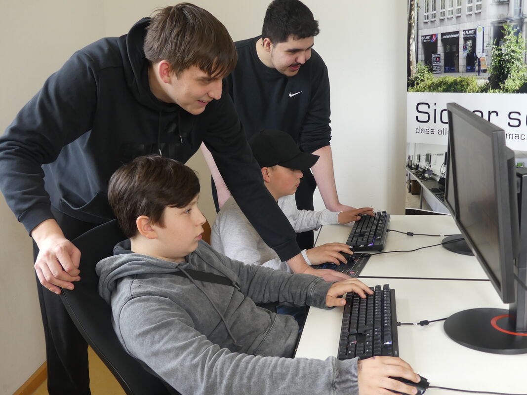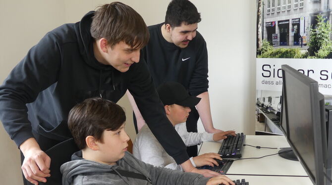 Jonas Wendt und Mertcan Irdem (hinten, von links) zeigen Tristan und Max (an den Tastaturen) wichtige Tricks. FOTO: KUGELE