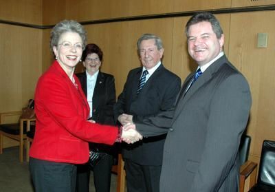 OB Barbara Bosch gratuliert Peter Seßler als neuem Leiter der Geschäftsstelle des Gemeinderats; im Hintergrund Mutter Ursula Seßler und Josef Teufel, Freund der Familie.