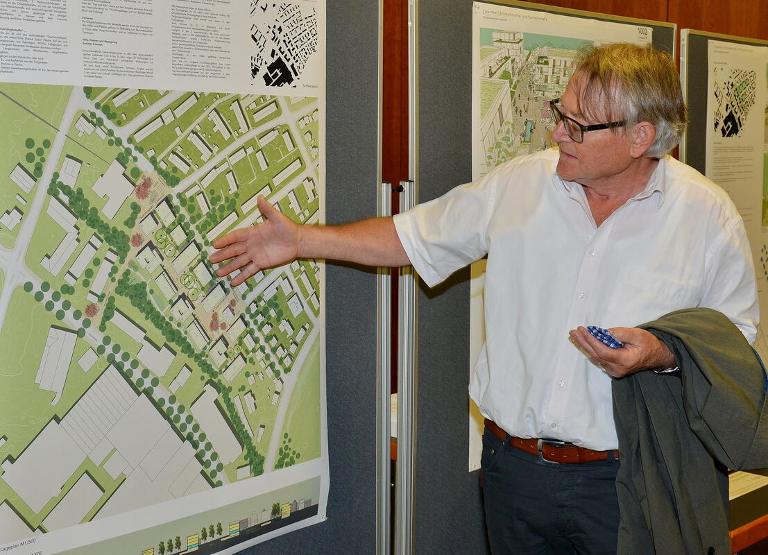 Wettbewerbsgewinner: Architekt Ulrich Schwille erläutert die Planungsstudie seines Teams für das Areal zwischen Christoph- und Storlachstraße (alter Bauhof), auf dem vor allem Wohnungen entstehen sollen. FOTO: NIETHAMMER