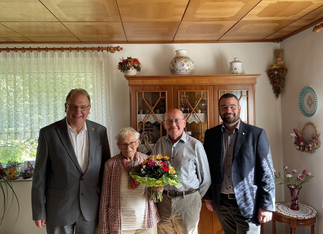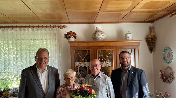 OB Thomas Keck (links) und Bezirksbürgermeister Friedemann Rupp (rechts) gratulieren dem Ehepaar März zur Gnadenhochzeit.
