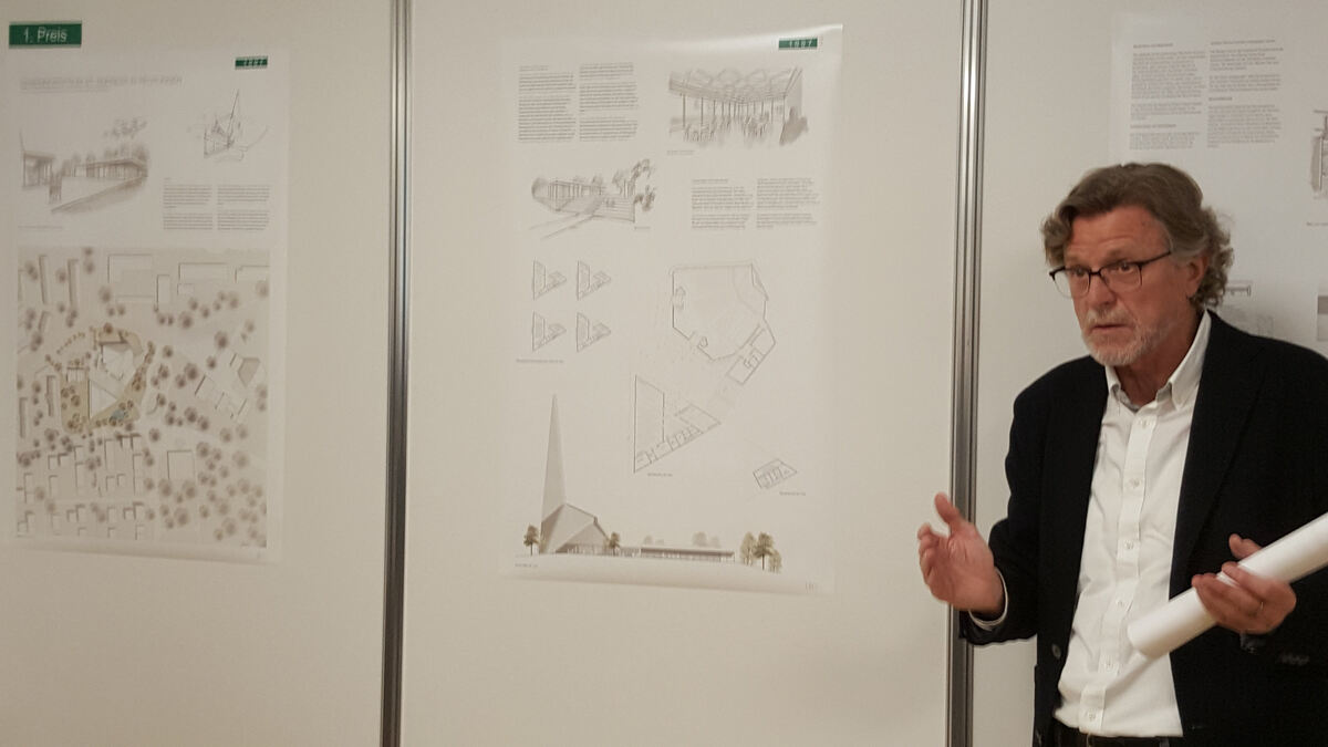 Zwischen sieben Entwürfen musste die Fach- und Sachjury im Vorfeld entscheiden. Wichtige Beurteilungskriterien waren die Verträglichkeit mit dem Umfeld, die Erfüllung der Funktionalität, die gestalterische und räumliche Qualität sowie Wirtschaftlichkeit und Nachhaltigkeit, wie Professor Gerd Ackermann, Architekt aus Tübingen und Moderator des Wettbewerbs, erklärte. In einem Rundgang im Gemeindesaal von St. Andreas erläuterte er interessierten Besuchern, warum vier Entwürfe frühzeitig ausgeschieden waren, aber vor allem, warum es drei Modelle unter die Top drei geschafft haben. Diese bestächen vor allem durch geradlinige Grundrisse, klare Anordnung der Räume, großzügige Flächen und durch einladende und offene Eingangssituationen, so Ackermann. »Die Plätze eins bis drei könnten alle gebaut werden.« Der Architekt selbst favorisiert den »mutigen« Entwurf einer triangularen Form, die mit der Kirche korrespondiert, und gleichzeitig die Alleinstellung des Kirchenbaus hervorhebt.