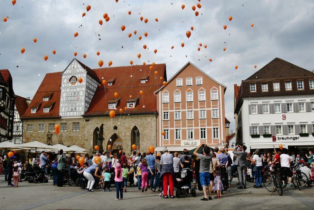 Ein Luftballon für jedes Kind ohne Betreuungsplatz: Gerk-Kundgebung auf dem Marktplatz. FOTO: BÖHM