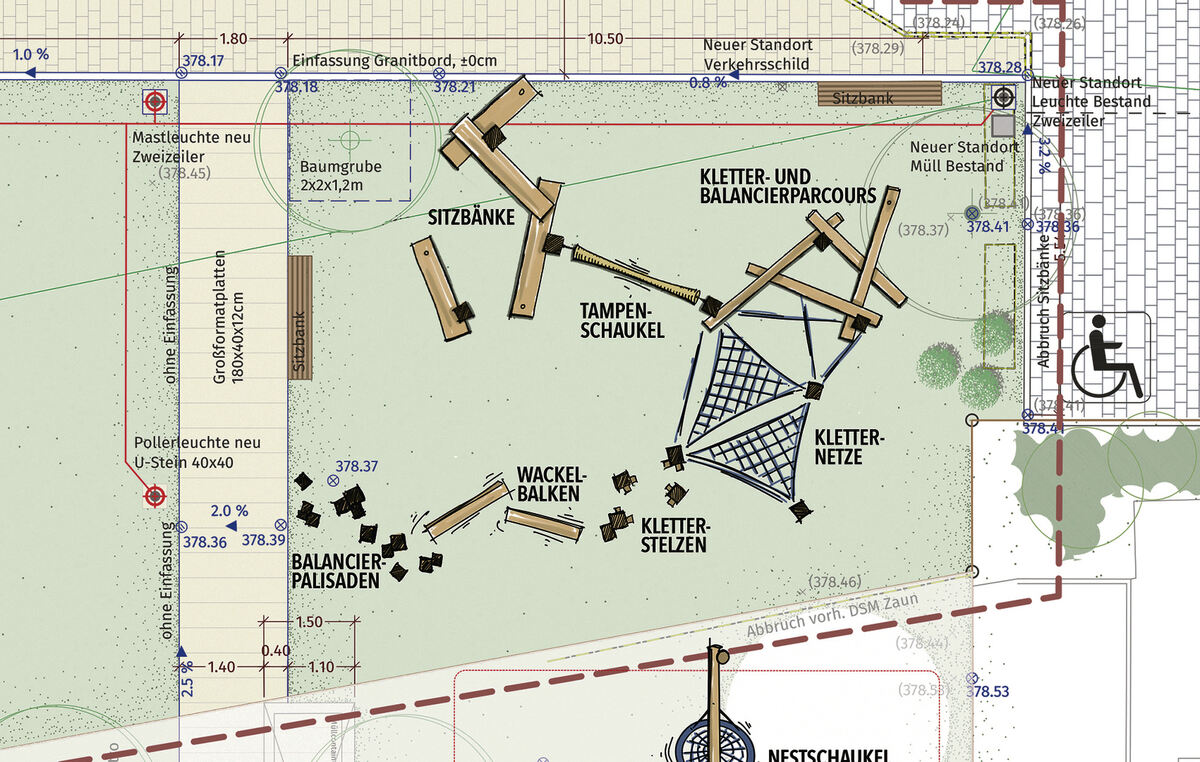 Mittlerweile ist die Planung des Spielplatzes fast abgeschlossen. Drei neue Spielgeräte sollen auf dem Gelände montiert werden. Darunter eine Netzschaukel, Kletterstelzen und ein großer Balancierparcours mit Wackelelementen. Eigentlich sollte noch ein Trampolin in den Boden eingebaut werden, doch daraus wird erstmal nichts. »Das Trampolin gibt zu wenig her, da meistens immer nur ein Kind springen kann«, findet Roland Knäbler. Um den Spielplatz sollen noch viele Bänke aufgestellt werden.