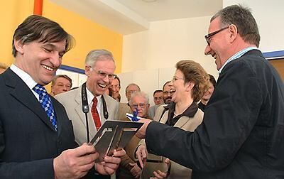 Blicken bei der Einweihung der »Oase IV« optimistisch in eine menschlichere Zukunft, von links: Karl-Heinz Walter, Klaus Kuntz, Barbara Bosch und Wolfgang Riehle.