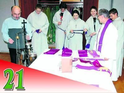 Letzte Vorbereitung für den Gottesdienst, nachgestellt für den GEA-Fotografen: Mesner Stefan Klettlinger prüft Weihwasserkessel und Rauchfass: Pfarrer Robert Widmann hat Albe und Stola angelegt, das Messgewand wartet »schlupffertig« vorn auf dem Tisch; die Ministranten Klaus Zippel, Johannes und Valentin Steinacker, Veronika Schenk und Tobias Albers binden ihr Zingulum.