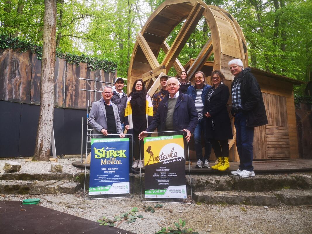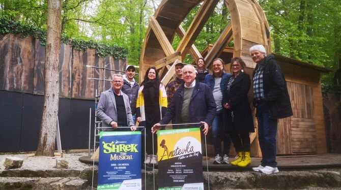 Auf der Bühne des Naturtheaters vor dem »Rad des Lebens« (von links): Rainer Kurze, Irfan Kars, Claudia Schickler, Oliver Krämer, Tilmann Scheck, Maja Rumswinkel, Michael Gaedt, Sibylle Schulz und Alexander Reuter. FOTO: CONZELMANN