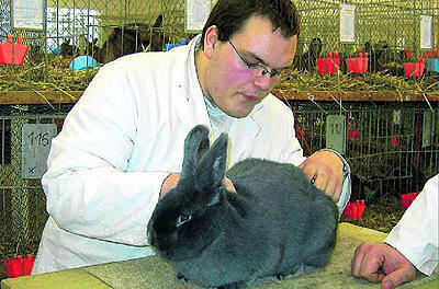 Preisrichter Stefan Huber pustet der Kaninchendame ins Fell, um die Färbung des Unterhaars zu begutachten.