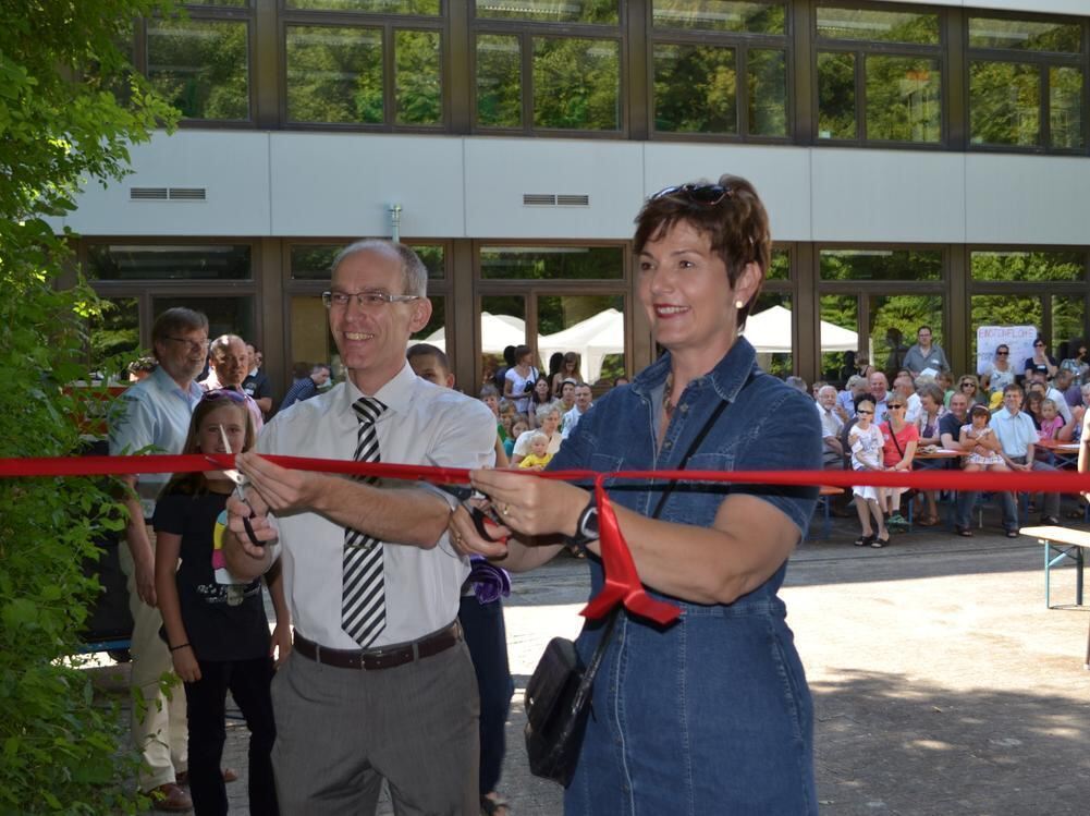Amtsleiter Uwe Weber und Dr. Susanne Pacher vom Regierungspräsidium eröffneten beim gemeinsamen Fest von Albert-Einstein-Gymnasium und Peter-Rosegger-Schule offiziell den Verbindungsweg.