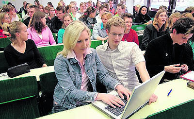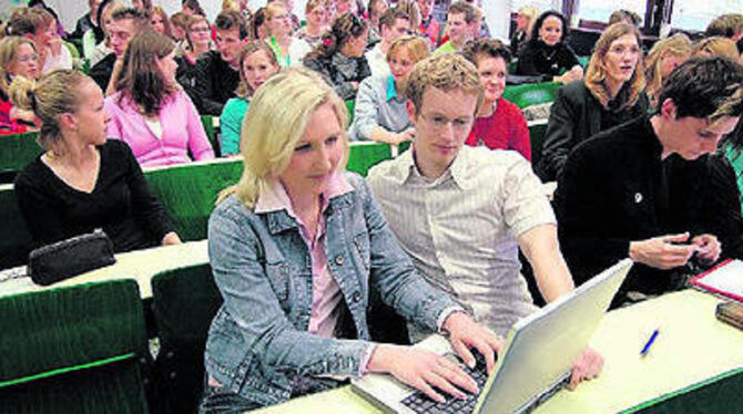 Empfinden ihr Studium an der Reutlinger »SIB« als Gewinn: Daniela Rehm und Daniel Gredel (am Laptop).