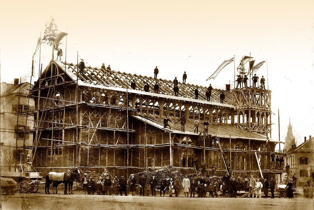 Richtfest am 14. November 1893: Die Leonhardskirche steht, stolz auf ihrem Dach die Schar der Zimmerleute (Stadtarchiv Nr. 1990/517; Fotograf unbekannt). FOTO: GEA-ARCHIVBILD