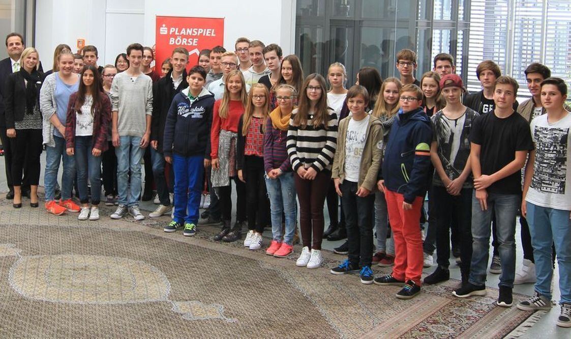 Startklar: Teilnehmer des Planspiels und der GEA-Aktion »Zeitung macht Schule« zu Gast bei der Kreissparkasse Reutlingen. Links im Bild: Benedetto Gianni und Selina Schenk, die das Spiel betreuen. FOTO: FINK