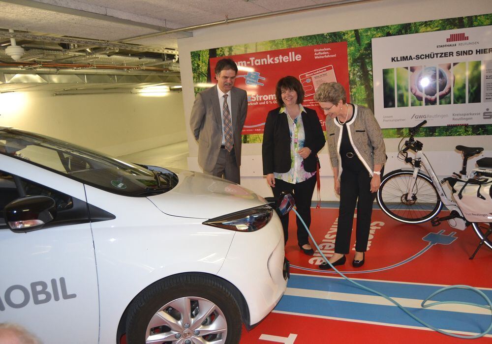 REUTLINGEN. Oberbürgermeisterin Barbara Bosch, Stadthallen-Geschäftsführerin Petra Roser und Heiko Suter, Geschäftsführer der Fair-Energie Reutlingen, haben die neue Elektro-Tankstelle in der Tiefgarage der Stadthalle offiziell in Betrieb genommen. An einer Zapfsäule mit zwei Ladeplätzen können Gäste der Stadthalle oder Besucher des Parkhauses ihre Fahrzeuge mit CO2-freiem Strom aufladen.