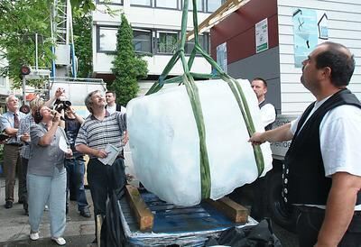 Heiße Aktion: Zum Dahinschmelzen gut ! Reutlingens Umweltbeauftragter Reinhard Braxmaier und die Eisblock-Fans waren begeistert, wie gering der Gewichtsverlust im gut gedämmten Passivhaus nach sieben Wochen ist.