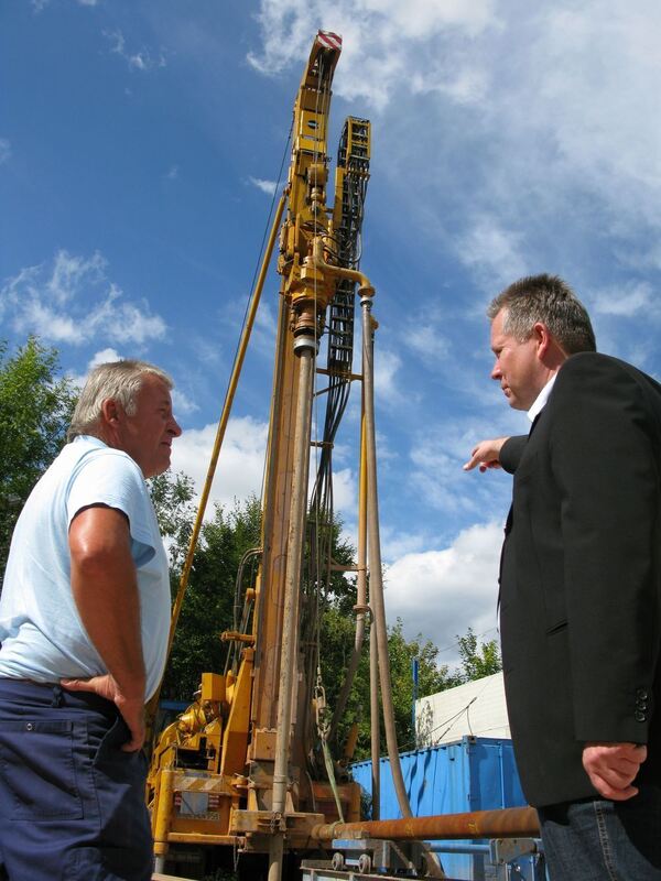 »Romina«-Geschäftsführer Stefan Gugel (rechts) erkundigt sich bei Bohrmeister Horst Antoskiewicz über den Fortschritt der Bohrungen. FOTO: RABE