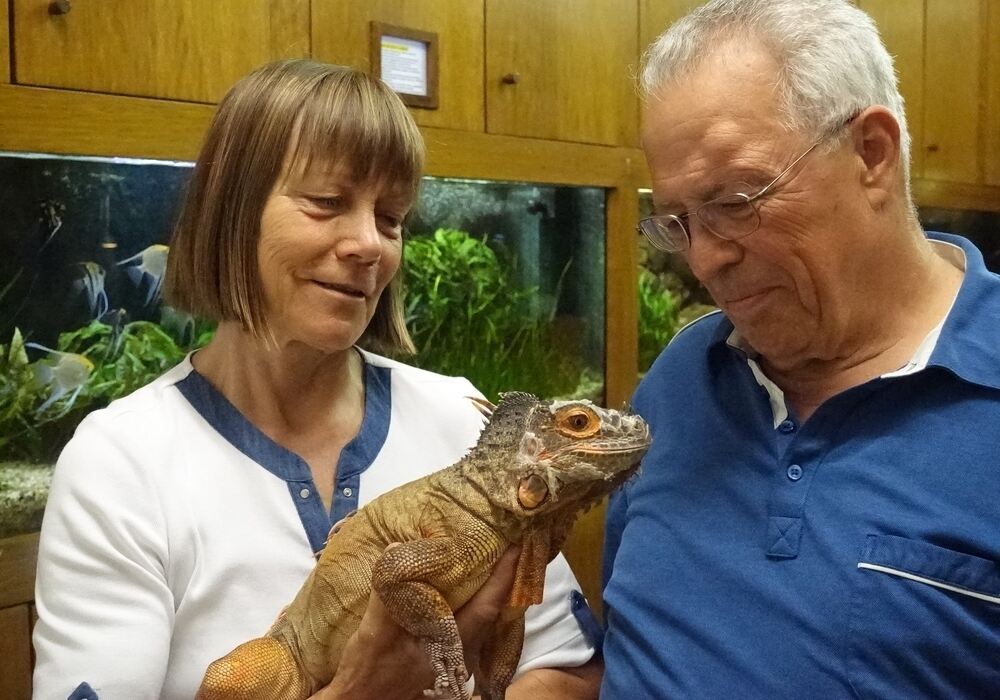 Petra Schütt, langjähriges Vereinsmitglied und Schriftführerin, hält Leguan-Dame Elsa im Arm. Werner Henne stellt es heute noch die Nackenhaare, wenn er daran denkt, wie das Tier auf dem Grobmüll entsorgt werden sollte. FOTO: DÖRR